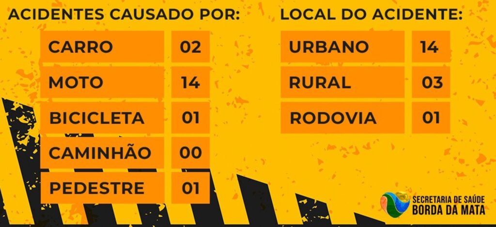 O Boletim de Acidentes de Trânsito de Borda da Mata apresentou o perfil epidemiológico dos acidentes ocorridos entre janeiro e maio de 2023. Embora o trânsito brasileiro seja violento, o município não registrou óbitos nesse período, porém os acidentes envolvendo motocicletas foram predominantes. A maioria dos acidentes ocorreu no perímetro urbano, com poucos casos na rodovia, que geralmente são atendidos pelo SAMU.