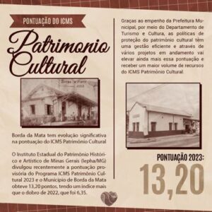 Neste ano, Borda da Mata obteve uma pontuação de 13,20 pontos, o que representa mais que o dobro do índice alcançado em 2022, que foi de 6,35 pontos. Essa evolução significativa é fruto do empenho incansável da Prefeitura, por meio do Departamento de Turismo e Cultura, em desenvolver políticas eficientes de proteção do patrimônio cultural.