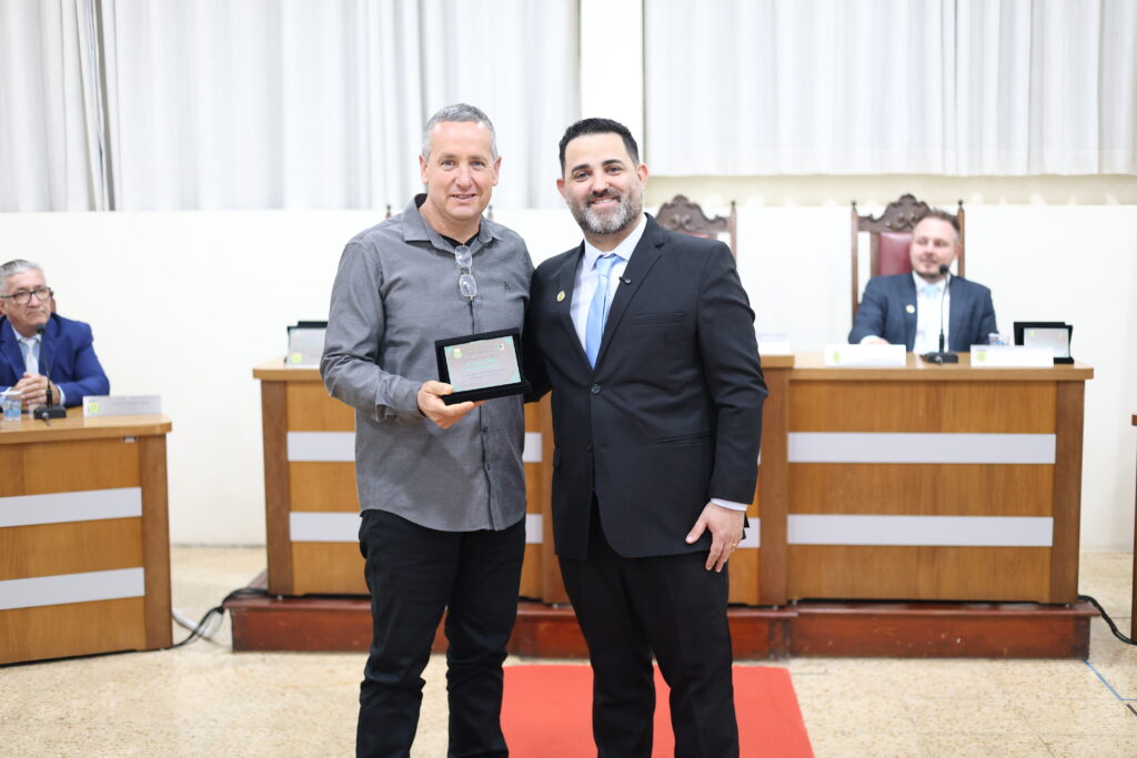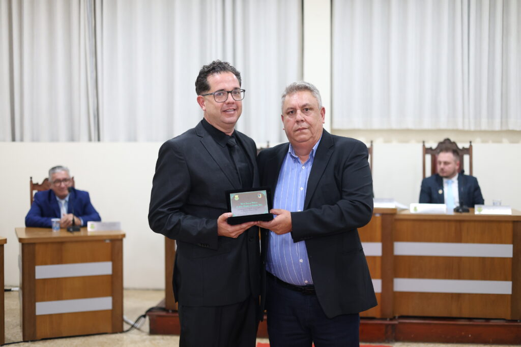 Joel Carlos Pereira de Toledo, advogado, ex-conselheiro tutelar e ex-comerciante, recebeu a honraria das mãos do vereador Luiz Carlos da Silva.