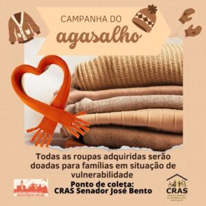 O inverno chegou com tudo. Por isso, a Prefeitura de Senador José Bentoe a Secretaria de Assistência Social estão lançando uma “Campanha do Agasalho” para recolher roupas, cobertores para doar para quem mais precisa.