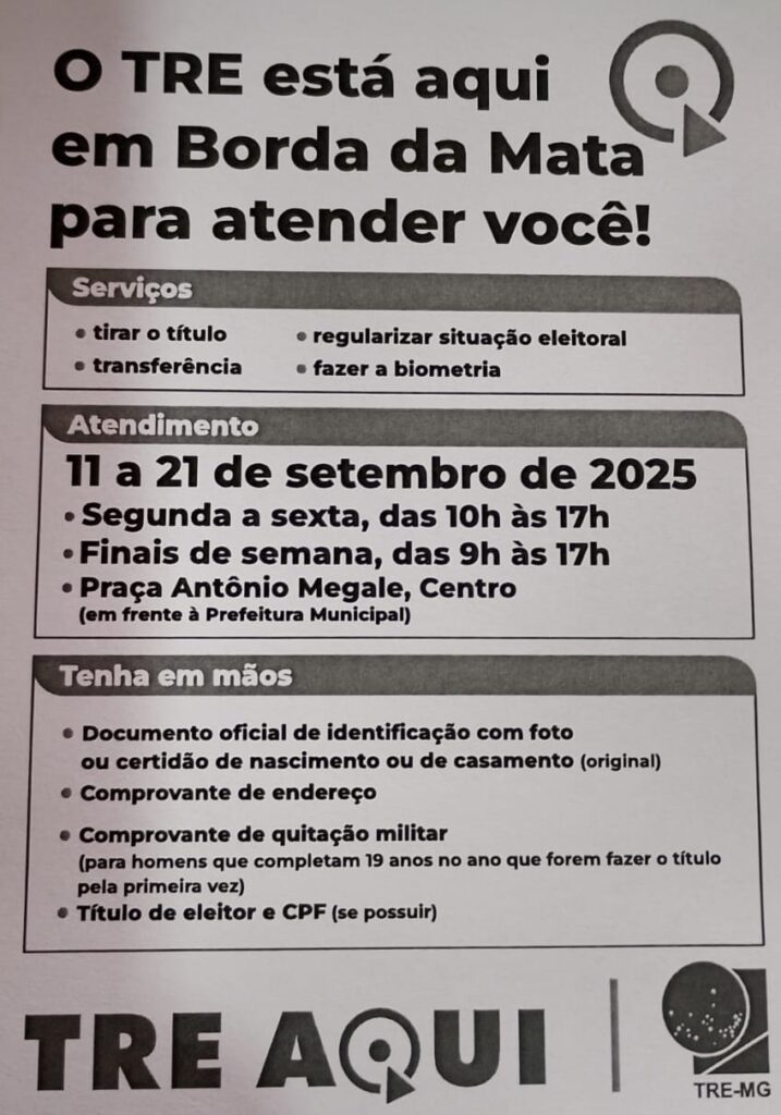 A população de Borda da Mata está convidada a comparecer, aproveitar os serviços e garantir o pleno exercício do direito ao voto. Regularizar a situação eleitoral é também uma forma de participar ativamente da vida política do município, de Minas Gerais e do Brasil.
