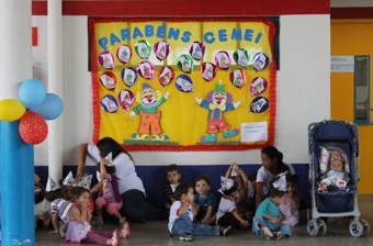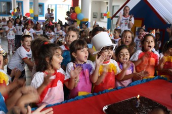 ?Na festa de comemoração de um ano de atividade, no dia 03/04/2013, as crianças do 2° estágio, da professora Rosilei Maria de Deus Barbosa, fizeram uma apresentação teatral em que prepararam o bolo do aniversário da escola. Depois, todos os alunos, cantaram parabéns e até sopraram a velinha do bolo. Durante a festa, estavam expostos os trabalhos realizados durante a semana com o tema da festa.