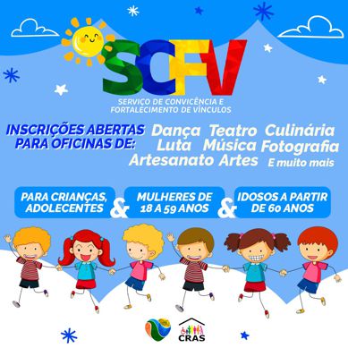 As oficinas são gratuitas, participe, faça inscrição no CRAS! Mais informações ligue: 3445-4988/3445-4985.