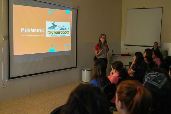 A professora e instrutora da Auto Escola Gírio a Sra. Ariana Danieli Oliveira da Silva preparou uma palestra, breve, mas muito instrutiva sobre a ‘Paz no trânsito’, tema da campanha Maio Amarelo de 2024, além de conhecimentos básicos sobre as leis de trânsito, boa conduta e regras da habilitação no país.