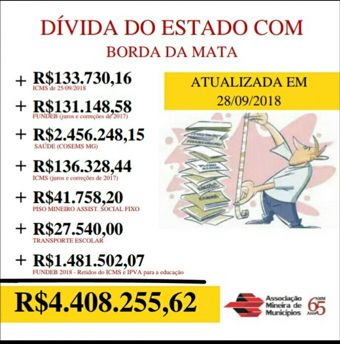 De acordo com relatório divulgado pela AMM (Associação Mineira de Municípios), em 28/09/2018, o Governo do Estado de Minas Gerais está com repasses constitucionais atrasados com o município de Borda da Mata no valor de R$ 4.408.255,62. A dívida de 4 milhões e quatrocentos e oito mil reais refere-se a manutenção de serviços básicos como EDUCAÇÃO e SAÚDE.