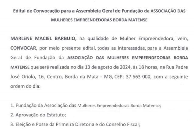 Edital de convenção para a Assembleia Geral de Fundação da ASSOCIAÇÃO DAS MULHERES EMPREENDEDORAS BORDAMATENSE