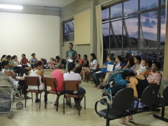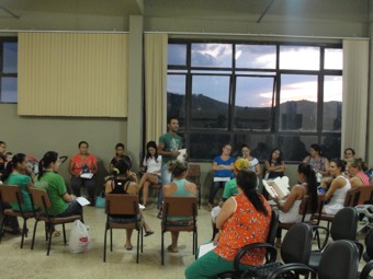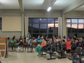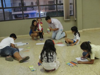 Enquanto os conversavam sobre o tema com o assistente social, o psicólogo coordenava um encontro com as crianças que acompanharam os pais na reunião, onde brincaram e falaram de maneira descontraída sobre família.