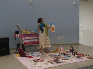 Com o objetivo de incentivar a prática de contar histórias, estimular a audição, provocar sentimentos e emoções através das histórias contadas e seus personagens, desenvolver a criatividade e a imaginação e encorajar os alunos a reconhecerem que suas histórias de vida são boas histórias a serem contadas, as atividades são desenvolvidas com recursos pedagógicos e lúdicos, como uma mala com objetos diversos: fantoches, avental, tapetes, máscaras, colcha de retalhos. Além de rodas de conversas para integração e interação entre todos. Os alunos adoraram as histórias e o modo de contá-las por Socorro Lacerda de Lacerda.