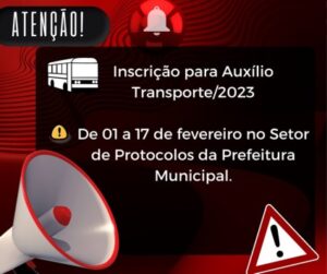 Estudantes universitários e de cursos técnicos e profissionalizantes, as inscrições para Auxílio Transporte 2023 terão início 01 de fevereiro. Documentação necessária: cópia dos documentos pessoais, comprovante de endereço, comprovante de matrícula. Fazer a leitura do Decreto 4797/2023 que se encontra no site da Prefeitura ou no quadro de publicações da sede da Prefeitura.