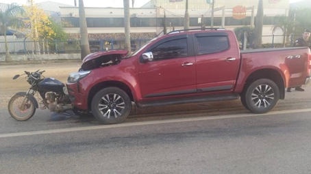 A moto ficou com a parte traseira grudada na frente da caminhonete, que afundou com o impacto.