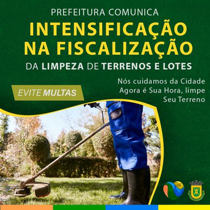 Nós cuidamos da Cidade. Agora é sua sora limpar seu Terreno.Evite multas e contribua para uma cidade mais limpa e segura. Contamos com a colaboração de todos os cidadãos para manter nossa cidade limpa, segura e acolhedora”, diz a Secretária de Obras, Rita de Pádua.