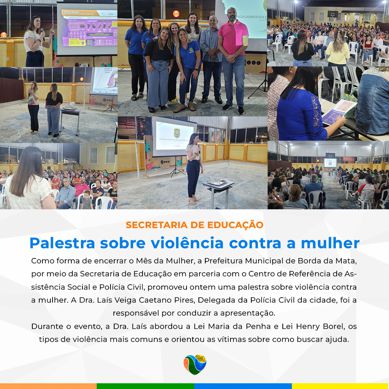 A cidade de Borda da Mata encerrou o Mês da Mulher com uma palestra sobre violência contra a mulher, organizada pela Prefeitura Municipal em parceria com a Secretaria de Educação, o Centro de Referência de Assistência Social e a Polícia Civil. A apresentação foi conduzida pela Dra. Laís Veiga Caetano Pires, Delegada da Polícia Civil da cidade, que trouxe importantes reflexões e orientações sobre o tema.