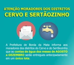 As contas de água referentes aos meses de agosto a dezembro de 2019 dos moradores dos dois distritos de Borda da Mata, Cervo e Sertãozinho, foram entregues antecipadamente em um único lote. As entregas aconteceram na primeira semana de outubro. A primeira conta, referente ao mês de agosto, está com vencimento prorrogado para o dia 20/10/2019.
