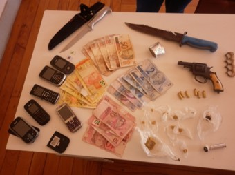 No dia 30 de janeiro, a Polícia Militar da cidade de Borda da Mata, durante Operação Antidrogas, em conjunto com a Polícia Civil, deslocou à Via VICINAL, S/Nº, Bairro CÓRREGO DAS PEDRAS, para dar cumprimento a um Mandado de Busca e Apreensão, expedido pelo MM. Juiz de Direito da Comarca de Borda da Mata. No local, a equipe, ao se posicionar para cercar a chácara, visualizou que o autor M. B. D. S., 22 anos, desocupado, que ao perceber a presença policial, tentou evadir pelos fundos da propriedade, e portava nas mãos um objeto semelhante a um Revólver, mas foi contido pelos militares Sgt. Luis, Sgt. Junqueira e Cb. Alex, os quais perseguiram o autor e conseguiram rendê-lo. O autor foi submetido à busca pessoal, e com ele encontrou-se um revólver calibre.32, marca ARENDI BREVETI, de cor bege, sem numeração, municiado com seis munições intactas do mesmo calibre, e dentro de uma pochete encontrou-se nove porções pequenas e um tablete com aproximadamente 16 gramas de uma substância semelhante ao crack, uma bucha de substância semelhante a maconha e R$538,00 em dinheiro. Durante as buscas no interior da residência, foram encontrados seis aparelhos celular de marcas diversas, um soco inglês, duas facas grandes (tipo de caça/pesca), e um rolo de alumínio, provavelmente utilizado para embalar as substâncias. Localizou-se também o veículo GM/MONZA, de cor preta, ano 1990, ao lado da residência, e após consulta, constatou-se uma restrição por estelionato contra o veículo, o qual foi removido ao pátio do guincho. Diante dos fatos, o autor recebeu voz de prisão em flagrante delito, e após ser atendido no Pronto Socorro, foi conduzido até a Delegacia local, juntamente com todos os materiais apreendidos, para demais providências. O autor já foi alvo de várias denúncias de tráfico de drogas e porte de arma de fogo na cidade, e inclusive por diversas vezes evadiu-se da viatura policial. Em uma das evasões, o autor chegou a efetuar disparos de arma de fogo em direção a viatura policial.