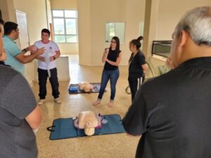 Na parte da manhã foi ministrada a parte teórica do curso e, logo após, todos foram para a prática, treinando em bonecos específicos, os quais simulavam situações de perigo no bebê, na criança e no adulto.
