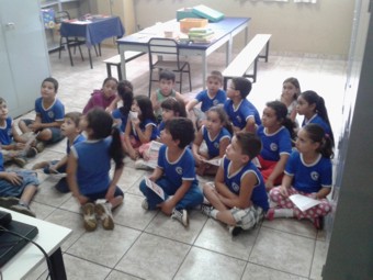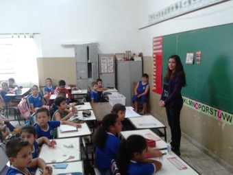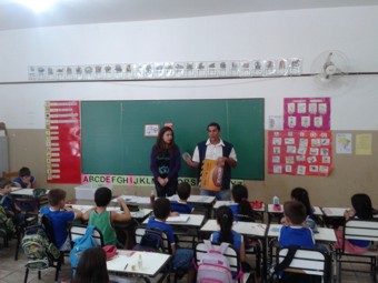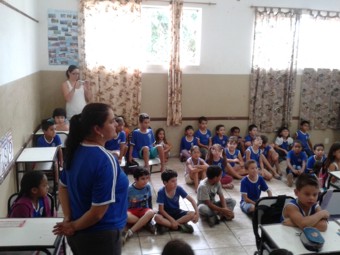 O supervisor de endemias do Setor de Epidemiologia, Robério Simão, e os agentes Jonas Guilherme Rocha e Daniele Aparecida do Couto falaram aos alunos sobre as medidas que cada um pode fazer em casa para não deixar acumular água e não dar chance para a aparição de focos do mosquito que transmite a Dengue.