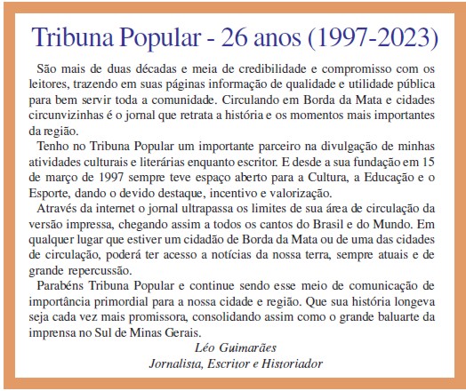 Parabéns Tribuna Popular e continue sendo esse meio de comunicação de importância primordial para a nossa cidade e região. Que sua história longeva seja cada vez mais promissora, consolidando assim como o grande baluarte da imprensa no Sul de Minas Gerais.