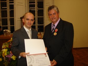 O Doutor em Agronomia, coordenador geral de produção e desenvolvimento no Instituto Federal Sul de Minas – Campus Inconfidentes e atual tesoureiro do Conselho Comunitário de Segurança Pública de Inconfidentes (CONSEPI), Wilson Roberto Pereira, recebeu, no dia 15 de dezembro, a “Medalha Desembargador Hélio Costa”, outorgada pela direção do Foro da Comarca de Ouro Fino, através da escolha unânime feita por uma comissão. A solenidade foi realizada no Salão Nobre do Tribunal do Júri no Fórum de Ouro Fino e contou com a presença de autoridades, servidores do Fórum, familiares e amigos do homenageado. A mesa de honra foi formada pelo MM. Juiz Diretor do Foro, Dr. João Cláudio Teodoro, Promotor de Justiça titular, Dr. Mário Corrêa da Silva Filho e pelo homenageado.
